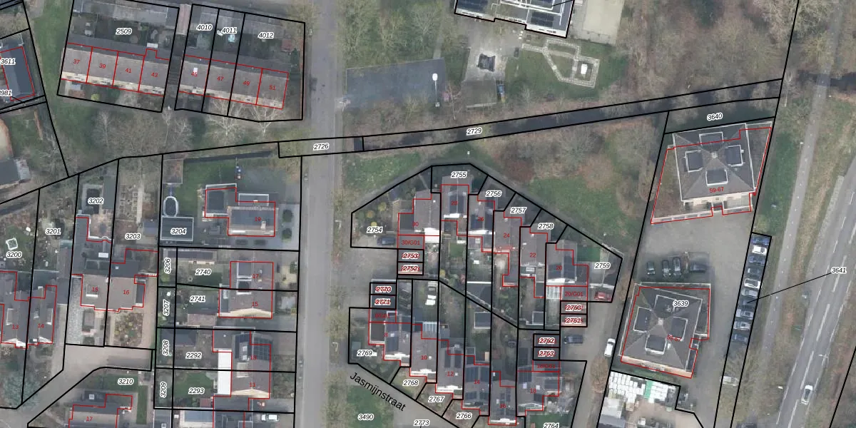 Het perceel waarop Jasmijnstraat 30 staat heeft een oppervlakte van 326 m². Dit is een groot perceel. De perceeloppervlakte wordt geregistreerd door het Kadaster. Gedetailleerde informatie over de maten van dit perceel kunt u vinden in het rapport Kadastrale kaart met maatvoering van Jasmijnstraat 30.