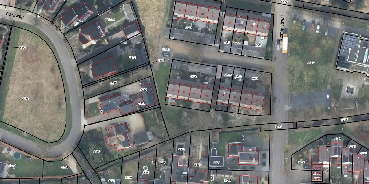 Het perceel waarop Jasmijnstraat 39 staat heeft een oppervlakte van 606 m². Dit is een groot perceel. De perceeloppervlakte wordt geregistreerd door het Kadaster. Gedetailleerde informatie over de maten van dit perceel kunt u vinden in het rapport Kadastrale kaart met maatvoering van Jasmijnstraat 39.