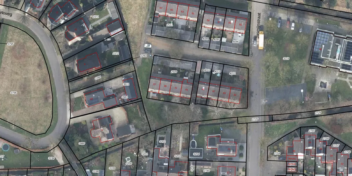 Het perceel waarop Jasmijnstraat 41 staat heeft een oppervlakte van 606 m². Dit is een groot perceel. De perceeloppervlakte wordt geregistreerd door het Kadaster. Gedetailleerde informatie over de maten van dit perceel kunt u vinden in het rapport Kadastrale kaart met maatvoering van Jasmijnstraat 41.