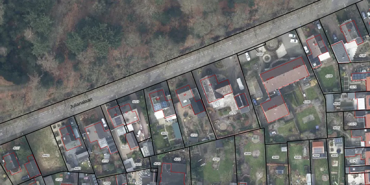 Het perceel waarop Julianalaan 65 staat heeft een oppervlakte van 615 m². Dit is een groot perceel. De perceeloppervlakte wordt geregistreerd door het Kadaster. Gedetailleerde informatie over de maten van dit perceel kunt u vinden in het rapport Kadastrale kaart met maatvoering van Julianalaan 65.