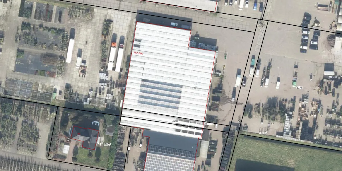 Het perceel waarop Kanaalweg 85-B staat heeft een oppervlakte van 9259 m². Dit is een zeer groot perceel. De perceeloppervlakte wordt geregistreerd door het Kadaster. Gedetailleerde informatie over de maten van dit perceel kunt u vinden in het rapport Kadastrale kaart met maatvoering van Kanaalweg 85-B.