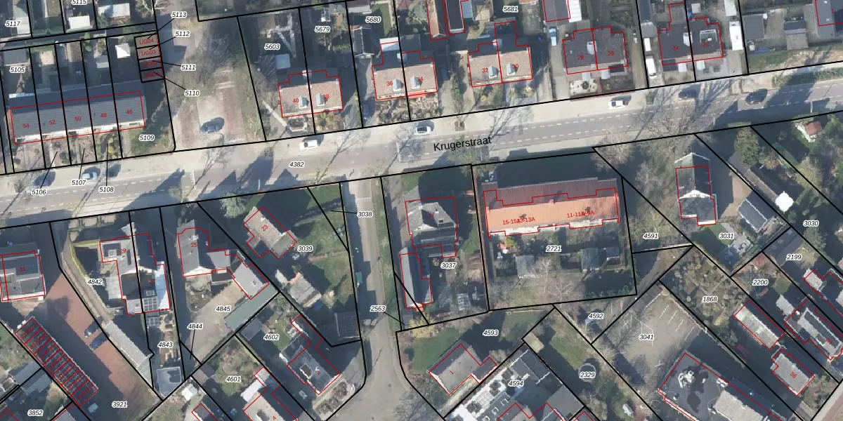 Het perceel waarop Krugerstraat 17 staat heeft een oppervlakte van 735 m². Dit is een groot perceel. De perceeloppervlakte wordt geregistreerd door het Kadaster. Gedetailleerde informatie over de maten van dit perceel kunt u vinden in het rapport Kadastrale kaart met maatvoering van Krugerstraat 17.
