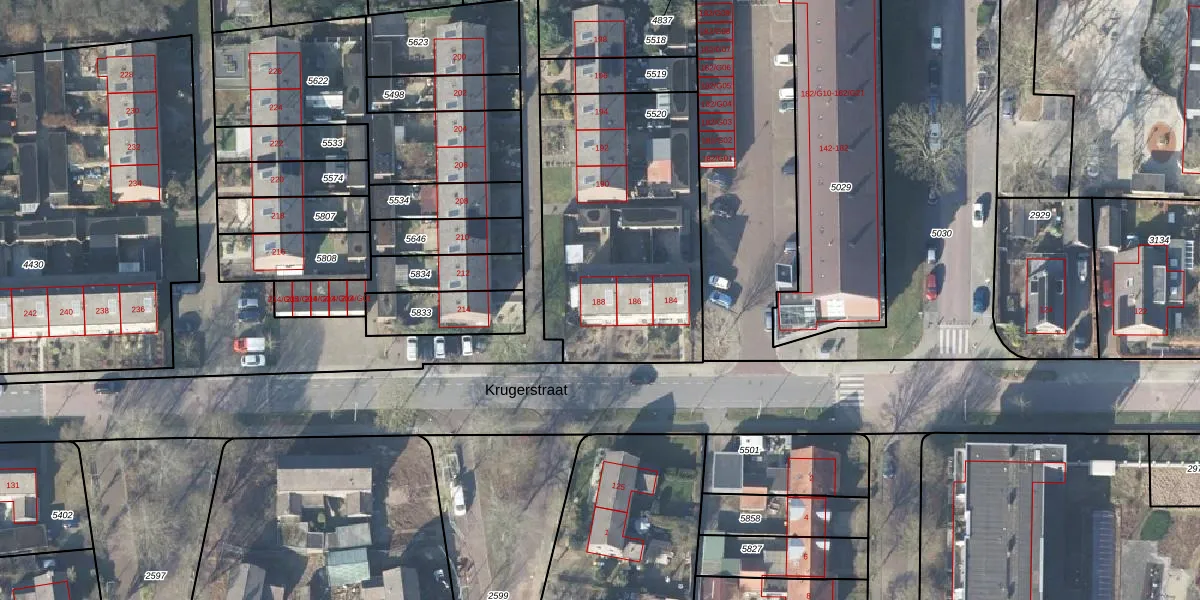 Krugerstraat 188 is gelegen op kadastraal perceel VSN02D5520. Deze kadastrale aanduiding is uniek en wordt gebruikt door het Kadaster om eigendomsrechten en andere zakelijke rechten vast te leggen. Het perceel maakt onderdeel uit van de kadastrale gemeente Vaassen.