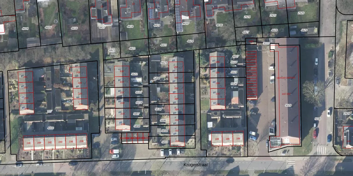 Het perceel waarop Krugerstraat 204 staat heeft een oppervlakte van 738 m². Dit is een groot perceel. De perceeloppervlakte wordt geregistreerd door het Kadaster. Gedetailleerde informatie over de maten van dit perceel kunt u vinden in het rapport Kadastrale kaart met maatvoering van Krugerstraat 204.