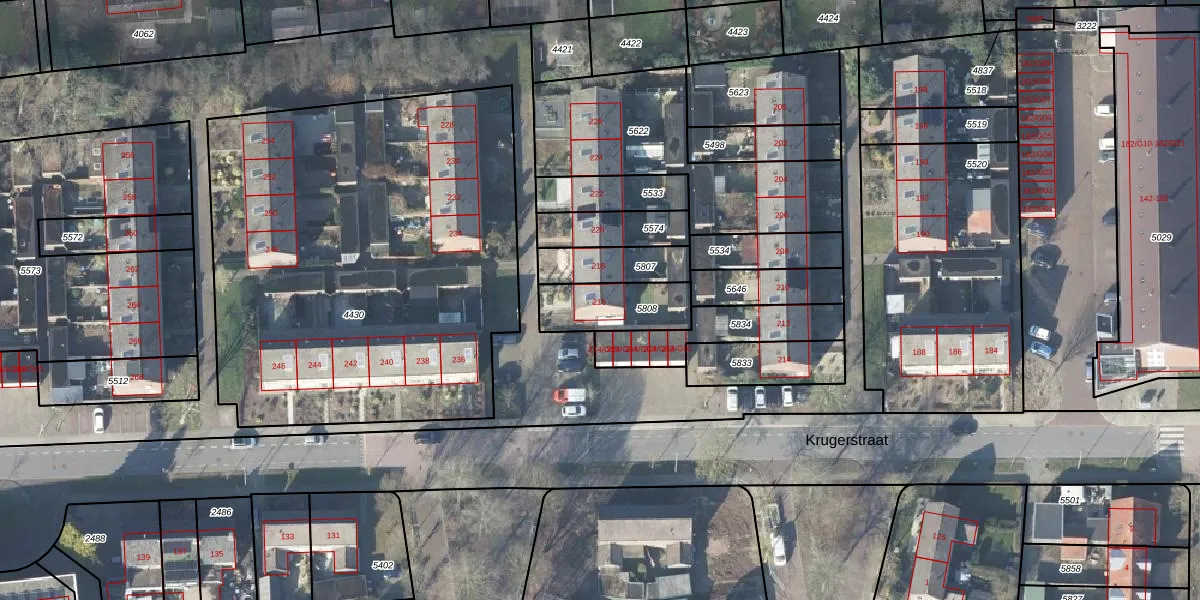 Het perceel waarop Krugerstraat 216 staat heeft een oppervlakte van 202 m². Dit is een middelgroot perceel. De perceeloppervlakte wordt geregistreerd door het Kadaster. Gedetailleerde informatie over de maten van dit perceel kunt u vinden in het rapport Kadastrale kaart met maatvoering van Krugerstraat 216.