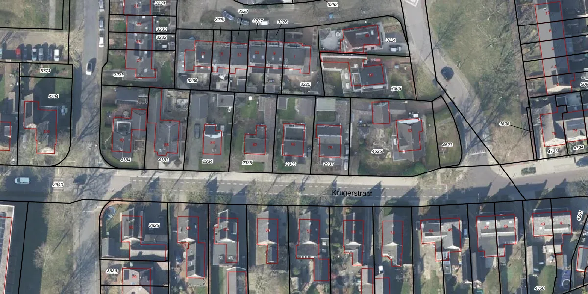 Het perceel waarop Krugerstraat 80 staat heeft een oppervlakte van 347 m². Dit is een groot perceel. De perceeloppervlakte wordt geregistreerd door het Kadaster. Gedetailleerde informatie over de maten van dit perceel kunt u vinden in het rapport Kadastrale kaart met maatvoering van Krugerstraat 80.