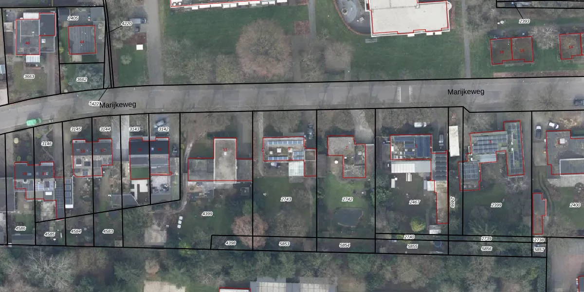 Het perceel waarop Marijkeweg 9 staat heeft een oppervlakte van 956 m². Dit is een groot perceel. De perceeloppervlakte wordt geregistreerd door het Kadaster. Gedetailleerde informatie over de maten van dit perceel kunt u vinden in het rapport Kadastrale kaart met maatvoering van Marijkeweg 9.