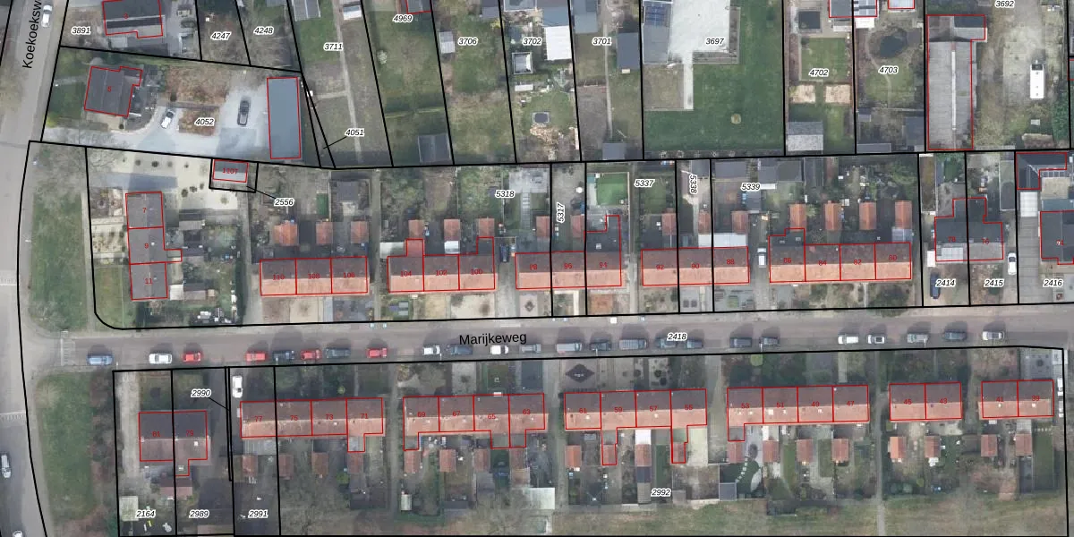 Het perceel waarop Marijkeweg 98 staat heeft een oppervlakte van 2523 m². Dit is een zeer groot perceel. De perceeloppervlakte wordt geregistreerd door het Kadaster. Gedetailleerde informatie over de maten van dit perceel kunt u vinden in het rapport Kadastrale kaart met maatvoering van Marijkeweg 98.