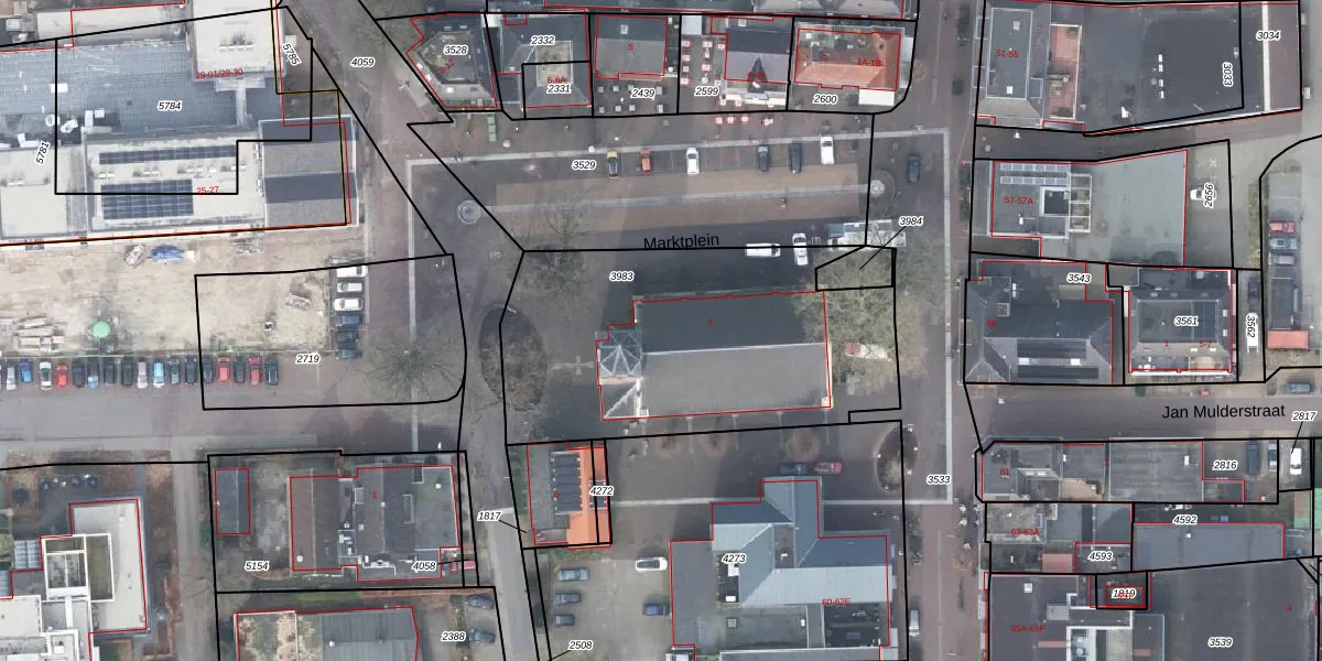 Het perceel waarop Marktplein 7 staat heeft een oppervlakte van 1583 m². Dit is een zeer groot perceel. De perceeloppervlakte wordt geregistreerd door het Kadaster. Gedetailleerde informatie over de maten van dit perceel kunt u vinden in het rapport Kadastrale kaart met maatvoering van Marktplein 7.