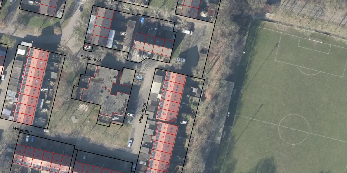 Het perceel waarop Plataanhof 23 staat heeft een oppervlakte van 1695 m². Dit is een zeer groot perceel. De perceeloppervlakte wordt geregistreerd door het Kadaster. Gedetailleerde informatie over de maten van dit perceel kunt u vinden in het rapport Kadastrale kaart met maatvoering van Plataanhof 23.
