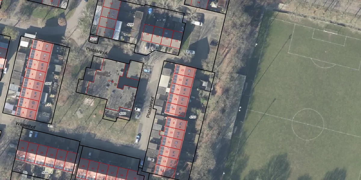 Het perceel waarop Plataanhof 24 staat heeft een oppervlakte van 1695 m². Dit is een zeer groot perceel. De perceeloppervlakte wordt geregistreerd door het Kadaster. Gedetailleerde informatie over de maten van dit perceel kunt u vinden in het rapport Kadastrale kaart met maatvoering van Plataanhof 24.