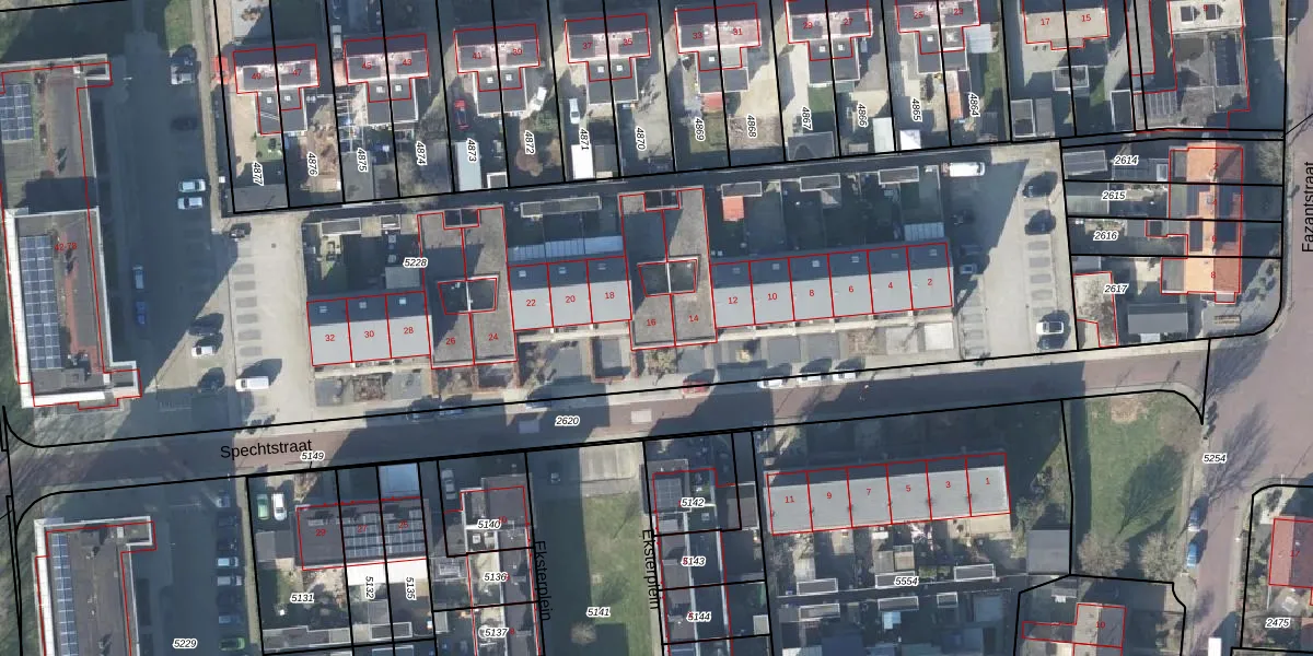 Het perceel waarop Spechtstraat 16 staat heeft een oppervlakte van 6660 m². Dit is een zeer groot perceel. De perceeloppervlakte wordt geregistreerd door het Kadaster. Gedetailleerde informatie over de maten van dit perceel kunt u vinden in het rapport Kadastrale kaart met maatvoering van Spechtstraat 16.