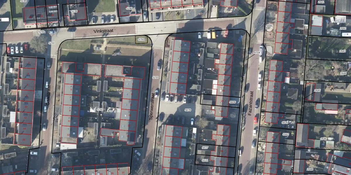 Het perceel waarop het adres ligt is VSN02-D-5678. De afkorting 'VSN02' staat voor kadastrale gemeente Vaassen. De gemiddelde perceelgrootte in Vaassen is 5564,98 m². Dit perceel is kleiner: de perceeloppervlakte bedraagt 3746 m². Het kleinste perceel in de kadastrale gemeente is 0 m² groot. De grootste perceeloppervlakte is 1,98 km². Op het perceel zijn 20 adressen aanwezig. In de Basisregistratie Kadaster (BRK) werden de grenzen van het perceel geregistreerd op 18-10-2019.