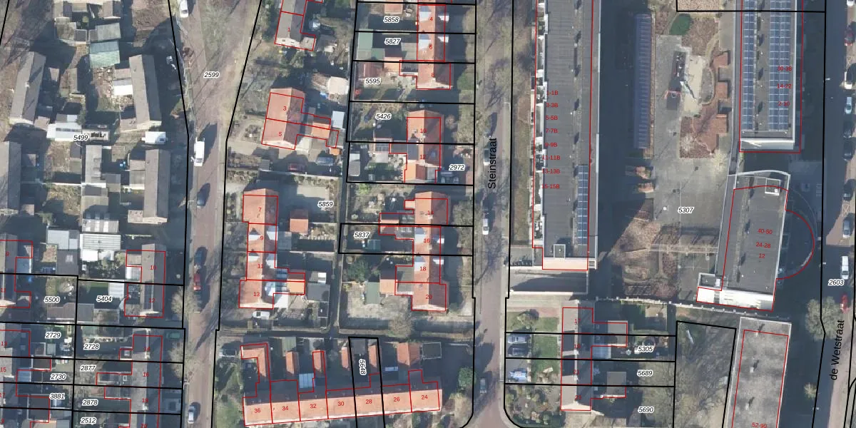 Het perceel waarop Steinstraat 14 staat heeft een oppervlakte van 4497 m². Dit is een zeer groot perceel. De perceeloppervlakte wordt geregistreerd door het Kadaster. Gedetailleerde informatie over de maten van dit perceel kunt u vinden in het rapport Kadastrale kaart met maatvoering van Steinstraat 14.