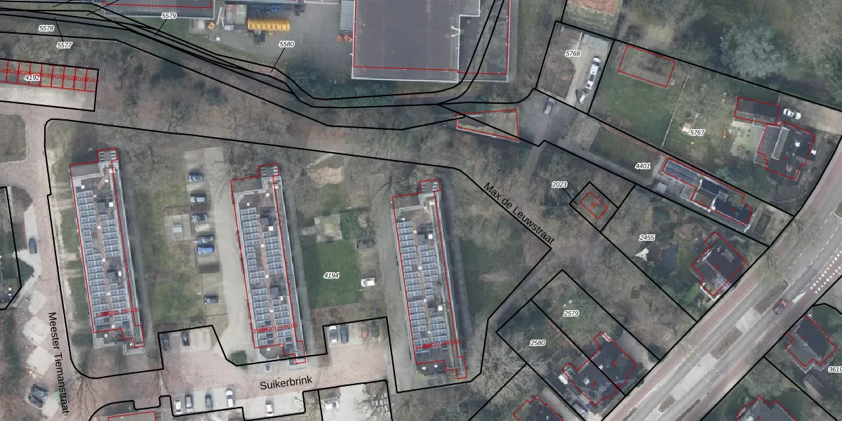 Het perceel waarop Suikerbrink 79 staat heeft een oppervlakte van 5379 m². Dit is een zeer groot perceel. De perceeloppervlakte wordt geregistreerd door het Kadaster. Gedetailleerde informatie over de maten van dit perceel kunt u vinden in het rapport Kadastrale kaart met maatvoering van Suikerbrink 79.