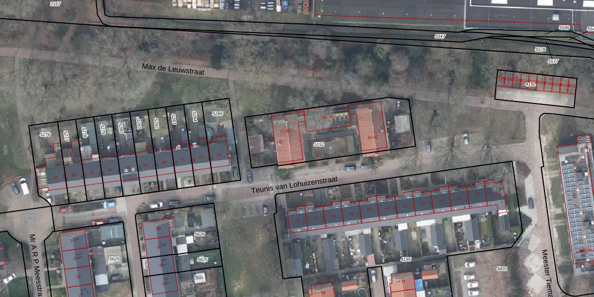 Het perceel waarop Teunis van Lohuizenstraat 77 staat heeft een oppervlakte van 978 m². Dit is een groot perceel. De perceeloppervlakte wordt geregistreerd door het Kadaster. Gedetailleerde informatie over de maten van dit perceel kunt u vinden in het rapport Kadastrale kaart met maatvoering van Teunis van Lohuizenstraat 77.