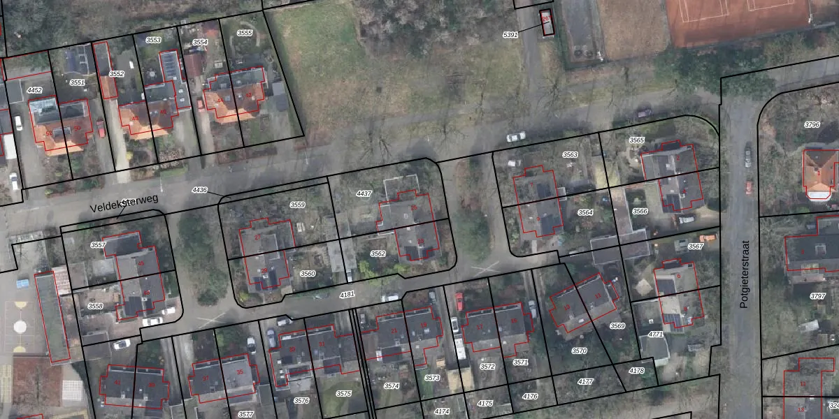 Het perceel waarop Veldeksterweg 25 staat heeft een oppervlakte van 400 m². Dit is een groot perceel. De perceeloppervlakte wordt geregistreerd door het Kadaster. Gedetailleerde informatie over de maten van dit perceel kunt u vinden in het rapport Kadastrale kaart met maatvoering van Veldeksterweg 25.