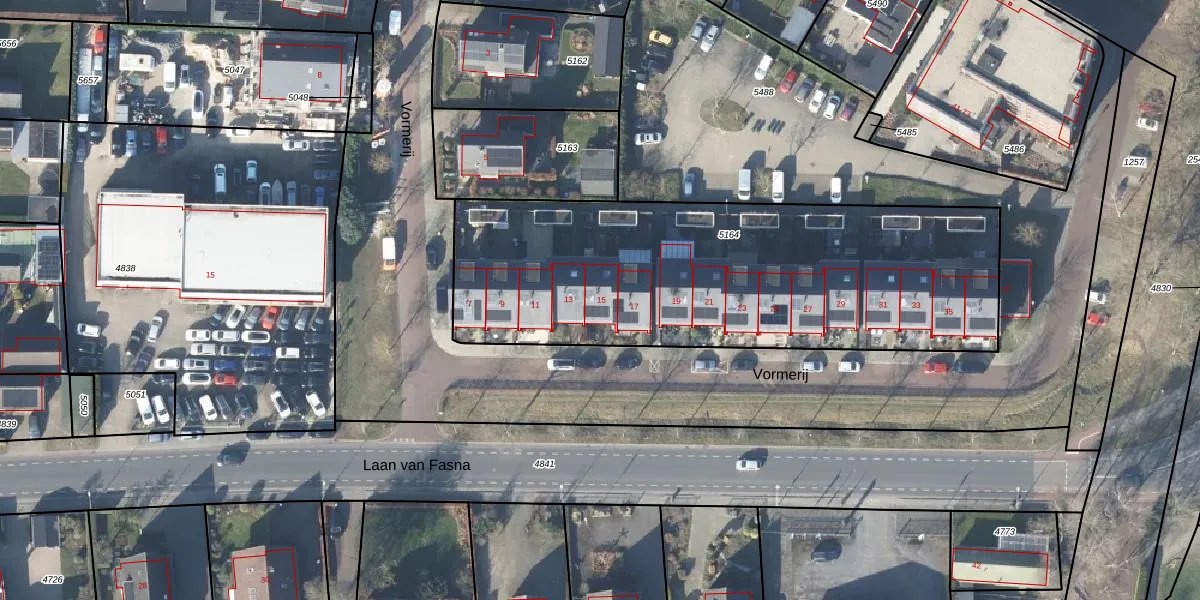 Het perceel waarop Vormerij 15 staat heeft een oppervlakte van 2185 m². Dit is een zeer groot perceel. De perceeloppervlakte wordt geregistreerd door het Kadaster. Gedetailleerde informatie over de maten van dit perceel kunt u vinden in het rapport Kadastrale kaart met maatvoering van Vormerij 15.
