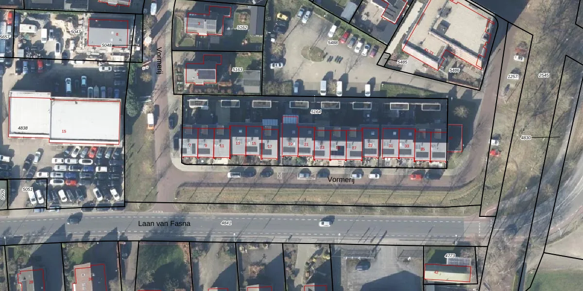 Het perceel waarop Vormerij 19 staat heeft een oppervlakte van 2185 m². Dit is een zeer groot perceel. De perceeloppervlakte wordt geregistreerd door het Kadaster. Gedetailleerde informatie over de maten van dit perceel kunt u vinden in het rapport Kadastrale kaart met maatvoering van Vormerij 19.