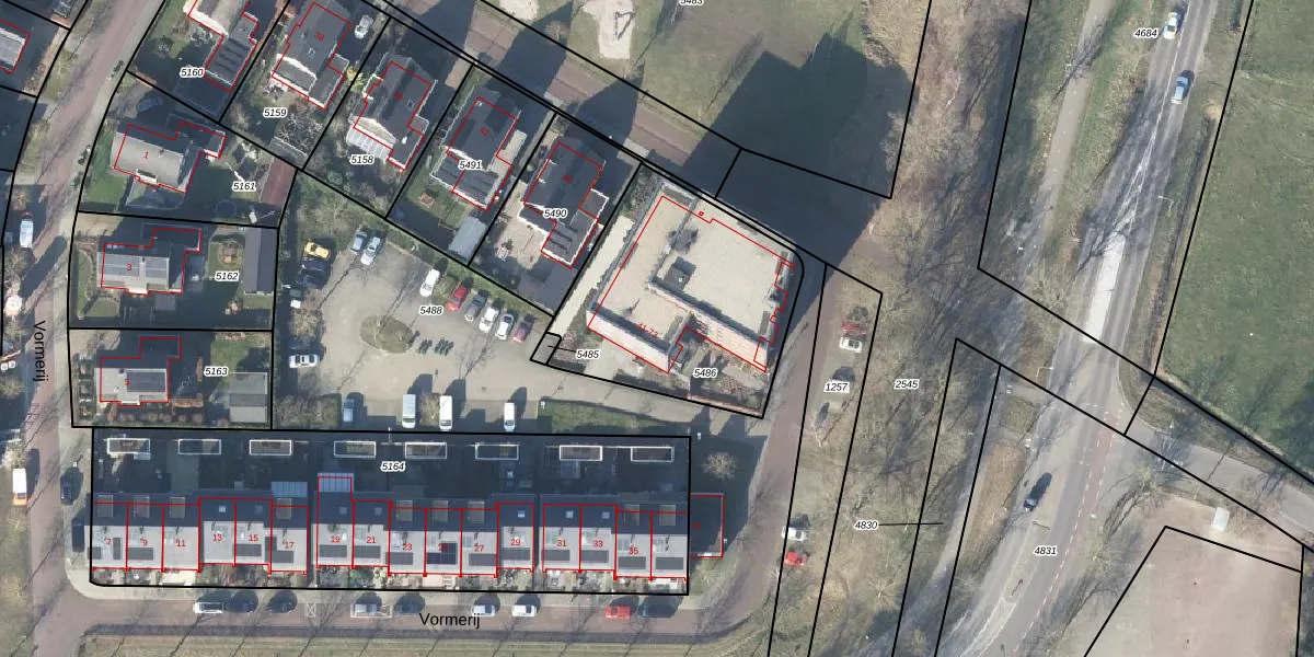 Het perceel waarop Vormerij 61 staat heeft een oppervlakte van 952 m². Dit is een groot perceel. De perceeloppervlakte wordt geregistreerd door het Kadaster. Gedetailleerde informatie over de maten van dit perceel kunt u vinden in het rapport Kadastrale kaart met maatvoering van Vormerij 61.