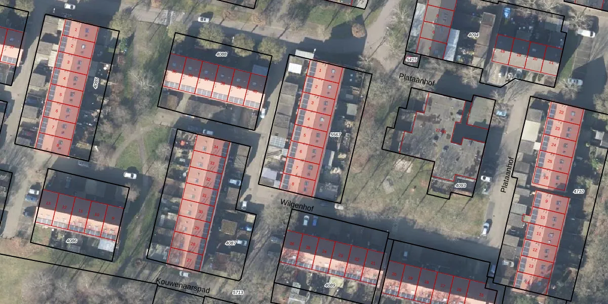 Het perceel waarop Wilgenhof 6 staat heeft een oppervlakte van 1227 m². Dit is een zeer groot perceel. De perceeloppervlakte wordt geregistreerd door het Kadaster. Gedetailleerde informatie over de maten van dit perceel kunt u vinden in het rapport Kadastrale kaart met maatvoering van Wilgenhof 6.