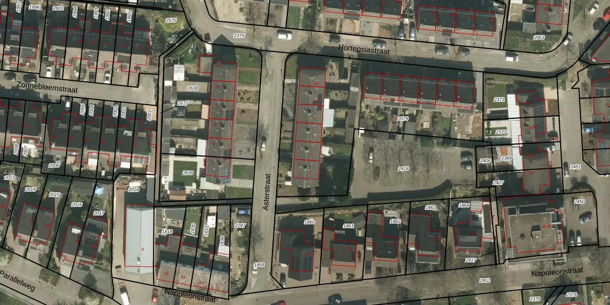 Het perceel waarop Asterstraat 4 staat heeft een oppervlakte van 2040 m². Dit is een zeer groot perceel. De perceeloppervlakte wordt geregistreerd door het Kadaster. Gedetailleerde informatie over de maten van dit perceel kunt u vinden in het rapport Kadastrale kaart met maatvoering van Asterstraat 4.