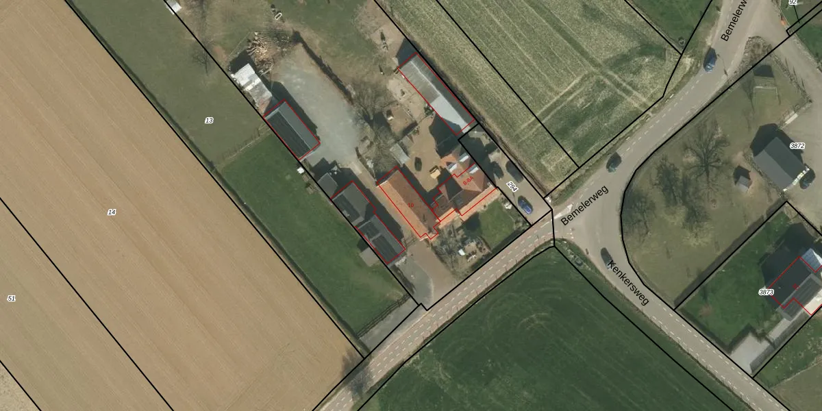 Het perceel waarop Bemelerweg 10 staat heeft een oppervlakte van 5275 m². Dit is een zeer groot perceel. De perceeloppervlakte wordt geregistreerd door het Kadaster. Gedetailleerde informatie over de maten van dit perceel kunt u vinden in het rapport Kadastrale kaart met maatvoering van Bemelerweg 10.