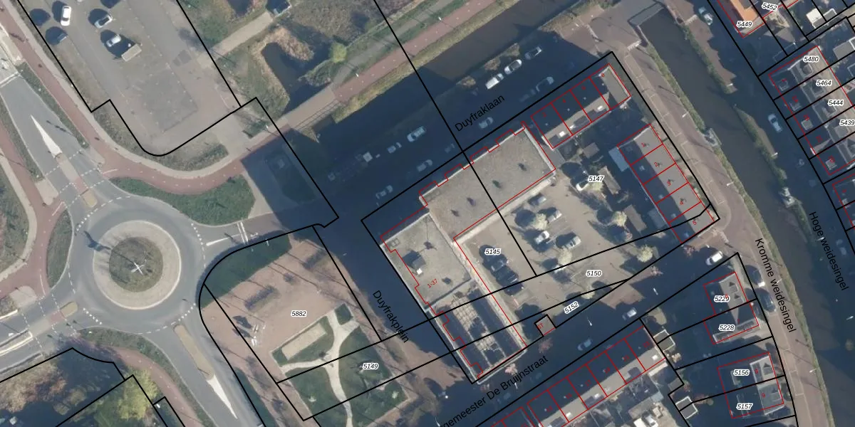 Het perceel waarop Duyfrakplein 36 staat heeft een oppervlakte van 856 m². Dit is een groot perceel. De perceeloppervlakte wordt geregistreerd door het Kadaster. Gedetailleerde informatie over de maten van dit perceel kunt u vinden in het rapport Kadastrale kaart met maatvoering van Duyfrakplein 36.
