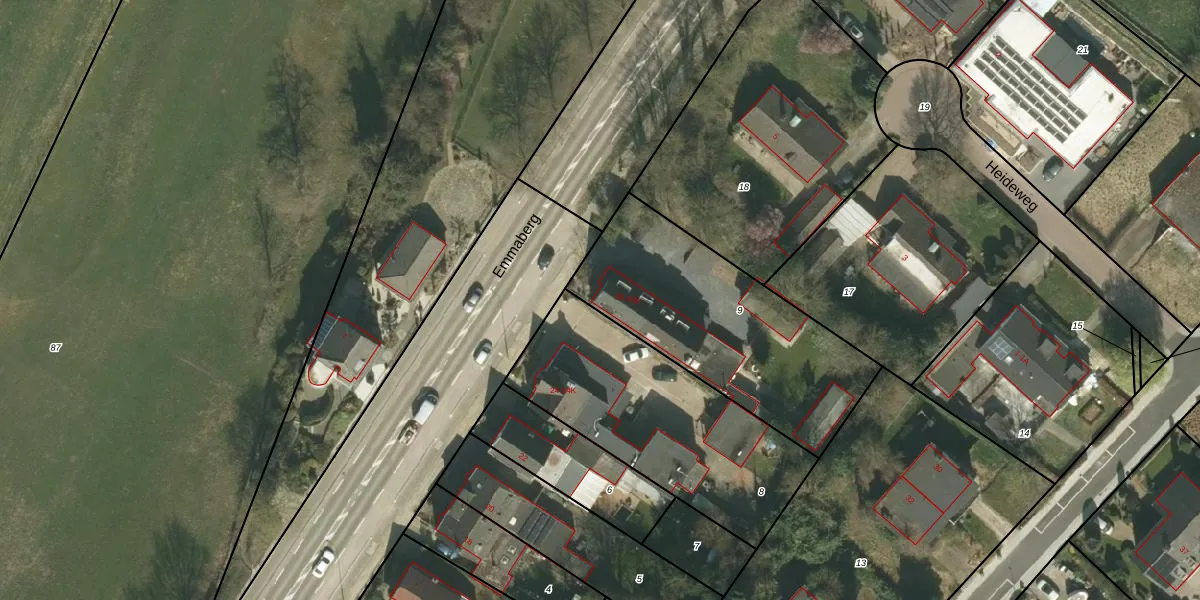 Het perceel waarop Emmaberg 26 staat heeft een oppervlakte van 957 m². Dit is een groot perceel. De perceeloppervlakte wordt geregistreerd door het Kadaster. Gedetailleerde informatie over de maten van dit perceel kunt u vinden in het rapport Kadastrale kaart met maatvoering van Emmaberg 26.