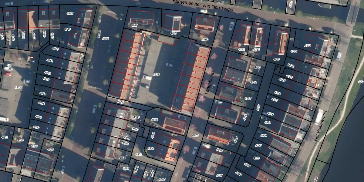 Het perceel waarop Langekamp 17 staat heeft een oppervlakte van 1943 m². Dit is een zeer groot perceel. De perceeloppervlakte wordt geregistreerd door het Kadaster. Gedetailleerde informatie over de maten van dit perceel kunt u vinden in het rapport Kadastrale kaart met maatvoering van Langekamp 17.