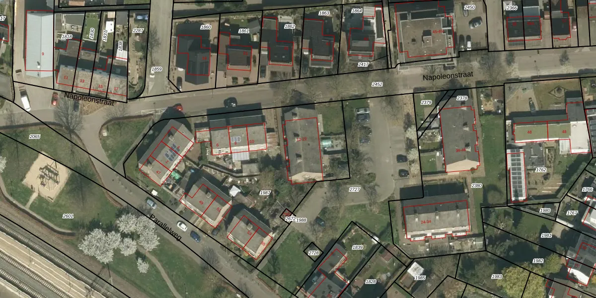 Het perceel waarop Napoleonstraat 18 staat heeft een oppervlakte van 2550 m². Dit is een zeer groot perceel. De perceeloppervlakte wordt geregistreerd door het Kadaster. Gedetailleerde informatie over de maten van dit perceel kunt u vinden in het rapport Kadastrale kaart met maatvoering van Napoleonstraat 18.