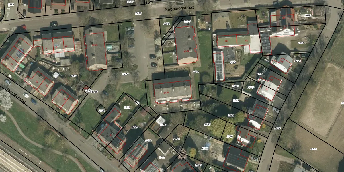Het perceel waarop Napoleonstraat 28 staat heeft een oppervlakte van 1560 m². Dit is een zeer groot perceel. De perceeloppervlakte wordt geregistreerd door het Kadaster. Gedetailleerde informatie over de maten van dit perceel kunt u vinden in het rapport Kadastrale kaart met maatvoering van Napoleonstraat 28.