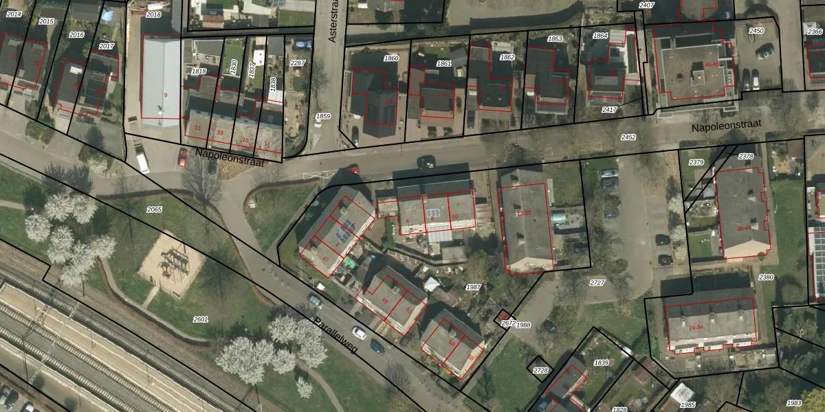 Het perceel waarop Napoleonstraat 6 staat heeft een oppervlakte van 2550 m². Dit is een zeer groot perceel. De perceeloppervlakte wordt geregistreerd door het Kadaster. Gedetailleerde informatie over de maten van dit perceel kunt u vinden in het rapport Kadastrale kaart met maatvoering van Napoleonstraat 6.
