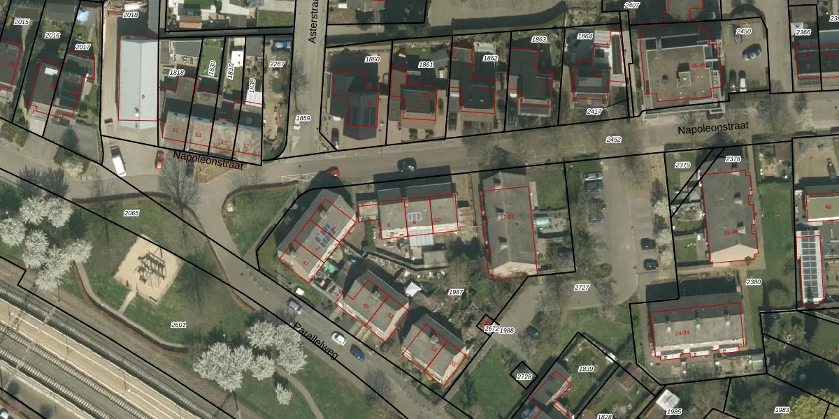 Het perceel waarop Napoleonstraat 8 staat heeft een oppervlakte van 2550 m². Dit is een zeer groot perceel. De perceeloppervlakte wordt geregistreerd door het Kadaster. Gedetailleerde informatie over de maten van dit perceel kunt u vinden in het rapport Kadastrale kaart met maatvoering van Napoleonstraat 8.