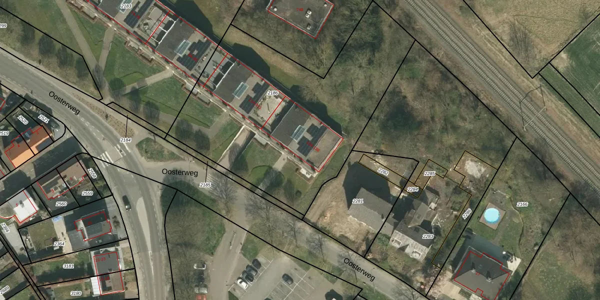Oosterweg 13-D is gelegen op kadastraal perceel SCH02B2186. Deze kadastrale aanduiding is uniek en wordt gebruikt door het Kadaster om eigendomsrechten en andere zakelijke rechten vast te leggen. Het perceel maakt onderdeel uit van de kadastrale gemeente Schin op Geul.