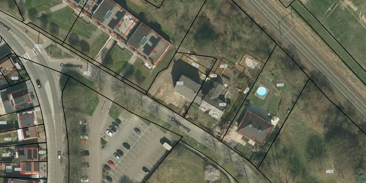 Oosterweg 15-B is gelegen op kadastraal perceel SCH02B2281. Deze kadastrale aanduiding is uniek en wordt gebruikt door het Kadaster om eigendomsrechten en andere zakelijke rechten vast te leggen. Het perceel maakt onderdeel uit van de kadastrale gemeente Schin op Geul.