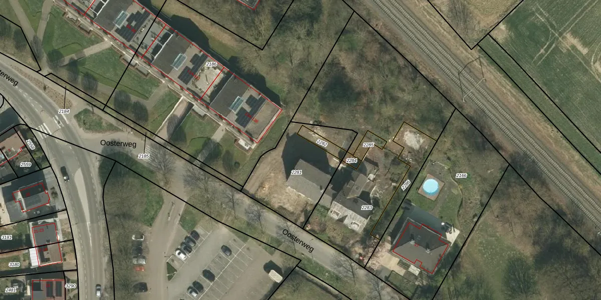 Oosterweg 15-L is gelegen op kadastraal perceel SCH02B2281. Deze kadastrale aanduiding is uniek en wordt gebruikt door het Kadaster om eigendomsrechten en andere zakelijke rechten vast te leggen. Het perceel maakt onderdeel uit van de kadastrale gemeente Schin op Geul.