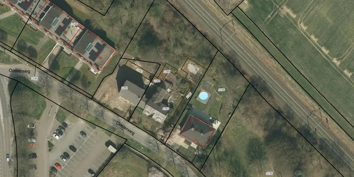 Oosterweg 15-T is gelegen op kadastraal perceel SCH02B2283. Deze kadastrale aanduiding is uniek en wordt gebruikt door het Kadaster om eigendomsrechten en andere zakelijke rechten vast te leggen. Het perceel maakt onderdeel uit van de kadastrale gemeente Schin op Geul.