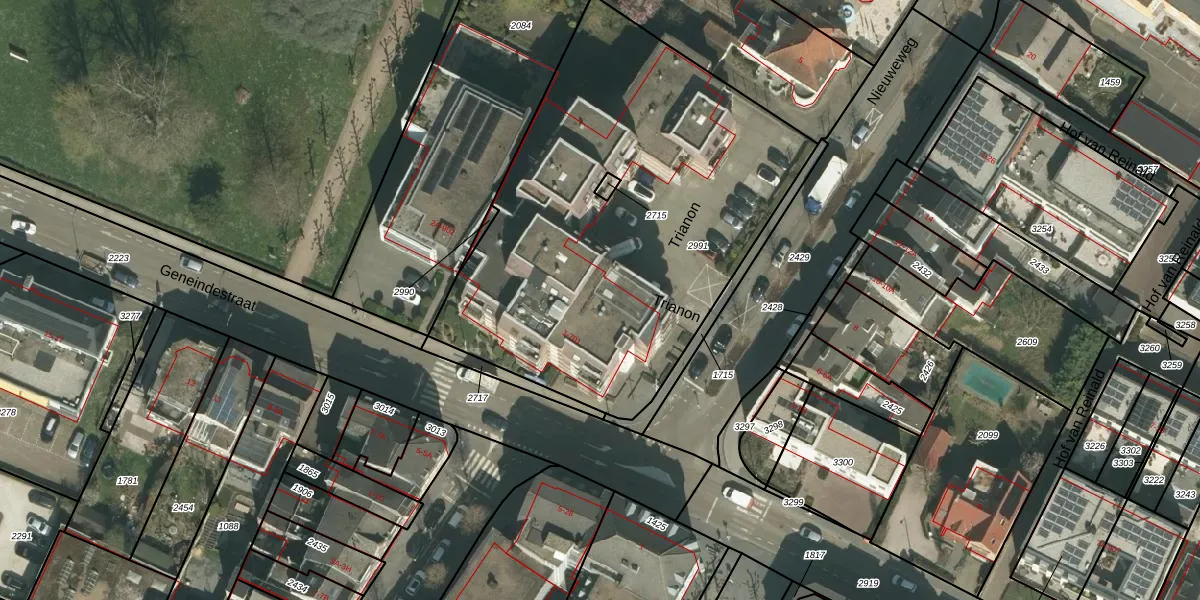 Het perceel waarop Trianon 26 staat heeft een oppervlakte van 2379 m². Dit is een zeer groot perceel. De perceeloppervlakte wordt geregistreerd door het Kadaster. Gedetailleerde informatie over de maten van dit perceel kunt u vinden in het rapport Kadastrale kaart met maatvoering van Trianon 26.