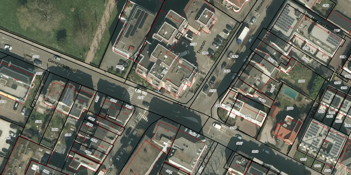 Het perceel waarop Trianon 38 staat heeft een oppervlakte van 2379 m². Dit is een zeer groot perceel. De perceeloppervlakte wordt geregistreerd door het Kadaster. Gedetailleerde informatie over de maten van dit perceel kunt u vinden in het rapport Kadastrale kaart met maatvoering van Trianon 38.