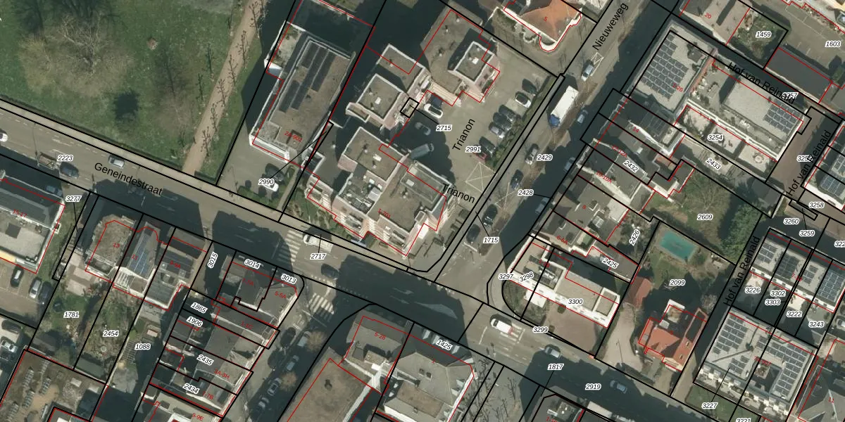 Het perceel waarop Trianon 45 staat heeft een oppervlakte van 2379 m². Dit is een zeer groot perceel. De perceeloppervlakte wordt geregistreerd door het Kadaster. Gedetailleerde informatie over de maten van dit perceel kunt u vinden in het rapport Kadastrale kaart met maatvoering van Trianon 45.