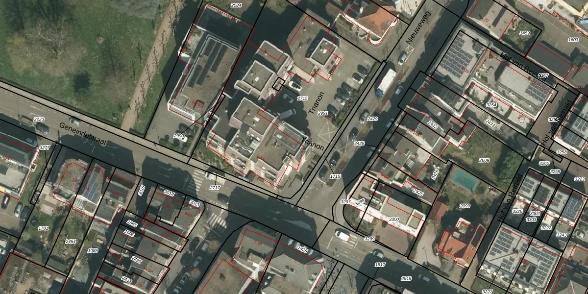 Het perceel waarop Trianon 46 staat heeft een oppervlakte van 2379 m². Dit is een zeer groot perceel. De perceeloppervlakte wordt geregistreerd door het Kadaster. Gedetailleerde informatie over de maten van dit perceel kunt u vinden in het rapport Kadastrale kaart met maatvoering van Trianon 46.