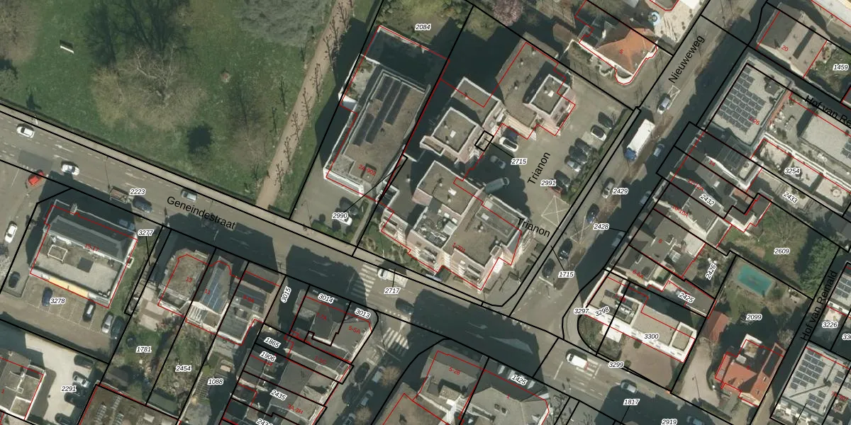 Het perceel waarop Trianon 7 staat heeft een oppervlakte van 2379 m². Dit is een zeer groot perceel. De perceeloppervlakte wordt geregistreerd door het Kadaster. Gedetailleerde informatie over de maten van dit perceel kunt u vinden in het rapport Kadastrale kaart met maatvoering van Trianon 7.