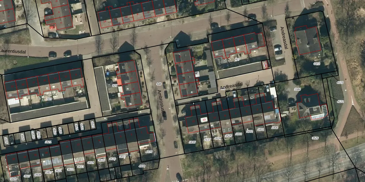 Het perceel waarop Ambrosiusdal 2 staat heeft een oppervlakte van 1441 m². Dit is een zeer groot perceel. De perceeloppervlakte wordt geregistreerd door het Kadaster. Gedetailleerde informatie over de maten van dit perceel kunt u vinden in het rapport Kadastrale kaart met maatvoering van Ambrosiusdal 2.