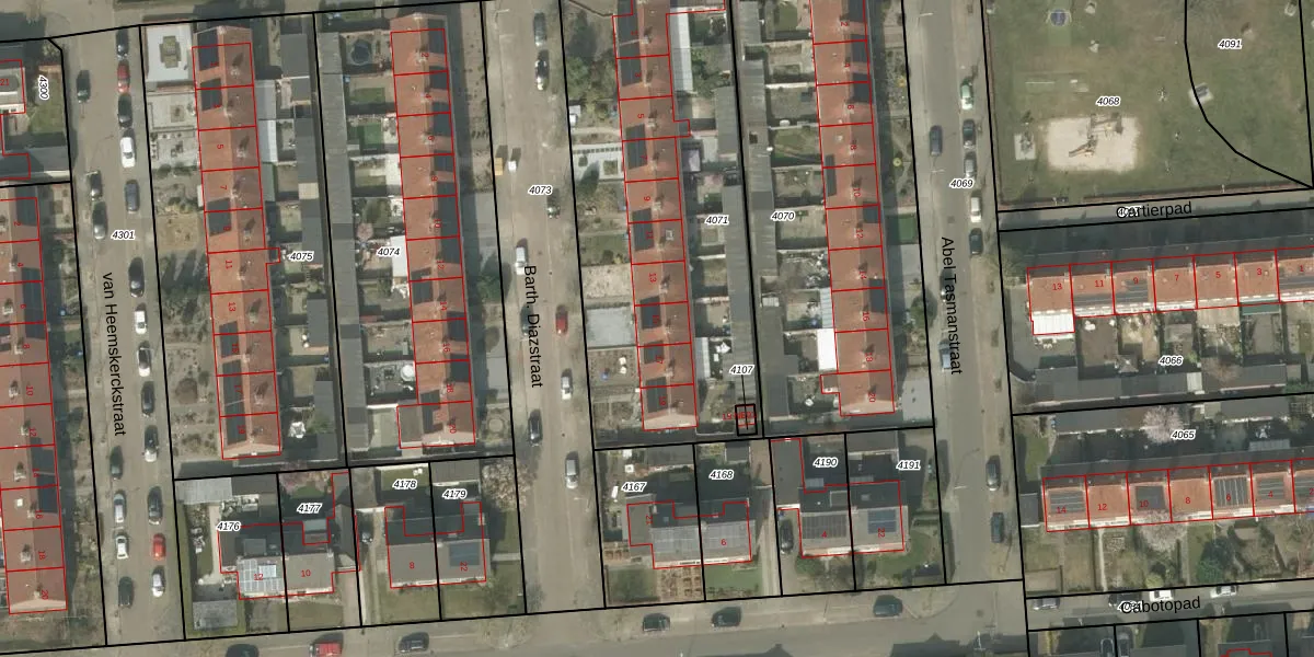 Het perceel waarop Barth. Diazstraat 15 staat heeft een oppervlakte van 1808 m². Dit is een zeer groot perceel. De perceeloppervlakte wordt geregistreerd door het Kadaster. Gedetailleerde informatie over de maten van dit perceel kunt u vinden in het rapport Kadastrale kaart met maatvoering van Barth. Diazstraat 15.