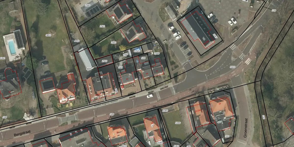 Bergstraat 44 is gelegen op kadastraal perceel VKW00G100. Deze kadastrale aanduiding is uniek en wordt gebruikt door het Kadaster om eigendomsrechten en andere zakelijke rechten vast te leggen. Het perceel maakt onderdeel uit van de kadastrale gemeente Valkenswaard.