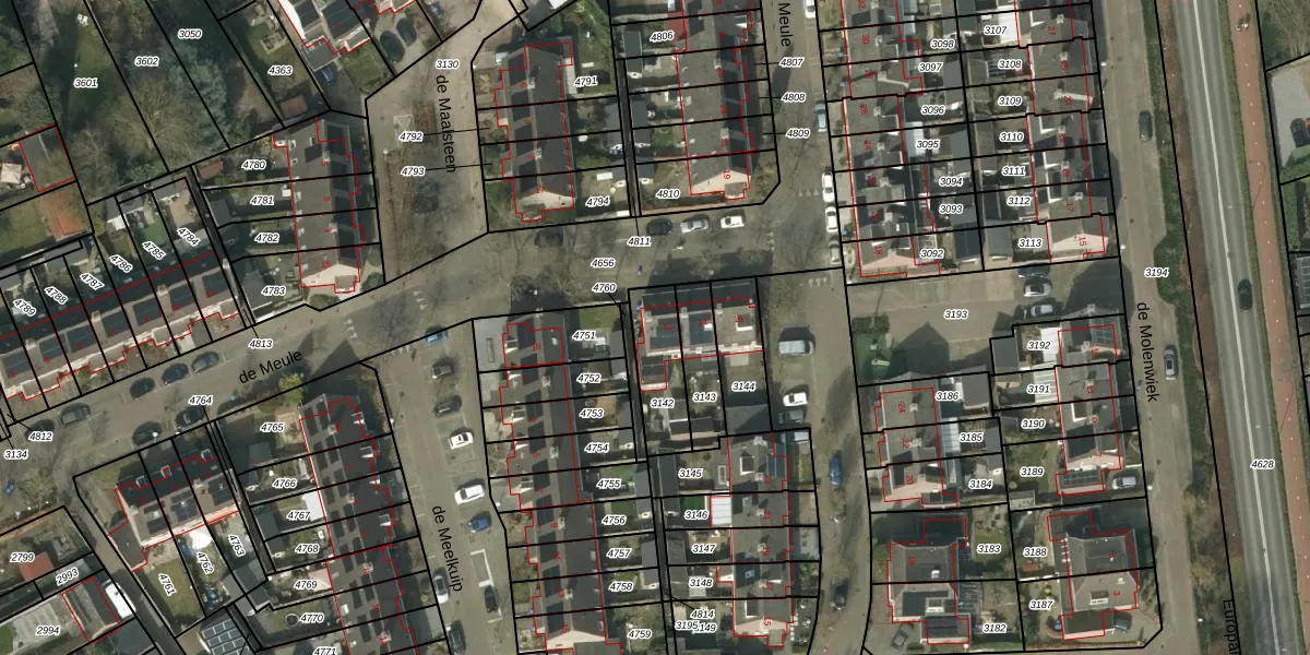 de Meule 12 is gelegen op kadastraal perceel VKW00F3142. Deze kadastrale aanduiding is uniek en wordt gebruikt door het Kadaster om eigendomsrechten en andere zakelijke rechten vast te leggen. Het perceel maakt onderdeel uit van de kadastrale gemeente Valkenswaard.