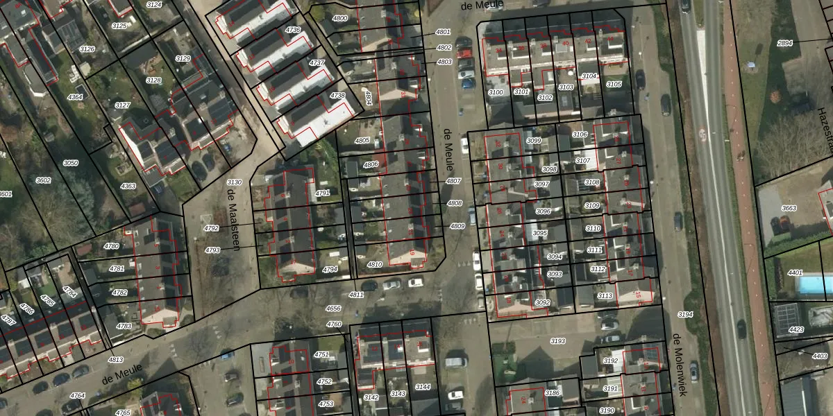 Het perceel waarop de Meule 23 staat heeft een oppervlakte van 116 m². Dit is een middelgroot perceel. De perceeloppervlakte wordt geregistreerd door het Kadaster. Gedetailleerde informatie over de maten van dit perceel kunt u vinden in het rapport Kadastrale kaart met maatvoering van de Meule 23.