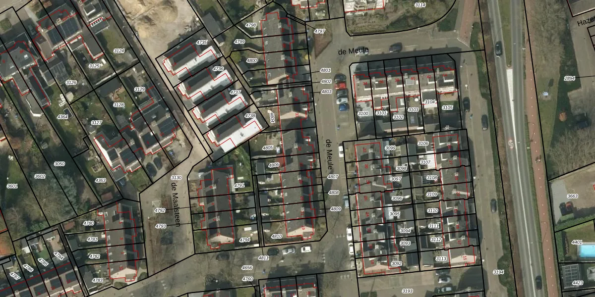 Het perceel waarop de Meule 29 staat heeft een oppervlakte van 195 m². Dit is een middelgroot perceel. De perceeloppervlakte wordt geregistreerd door het Kadaster. Gedetailleerde informatie over de maten van dit perceel kunt u vinden in het rapport Kadastrale kaart met maatvoering van de Meule 29.