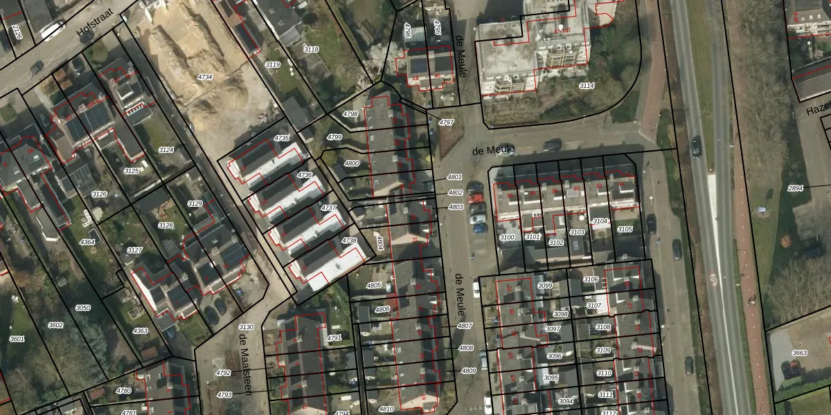 Het perceel waarop de Meule 33 staat heeft een oppervlakte van 110 m². Dit is een middelgroot perceel. De perceeloppervlakte wordt geregistreerd door het Kadaster. Gedetailleerde informatie over de maten van dit perceel kunt u vinden in het rapport Kadastrale kaart met maatvoering van de Meule 33.
